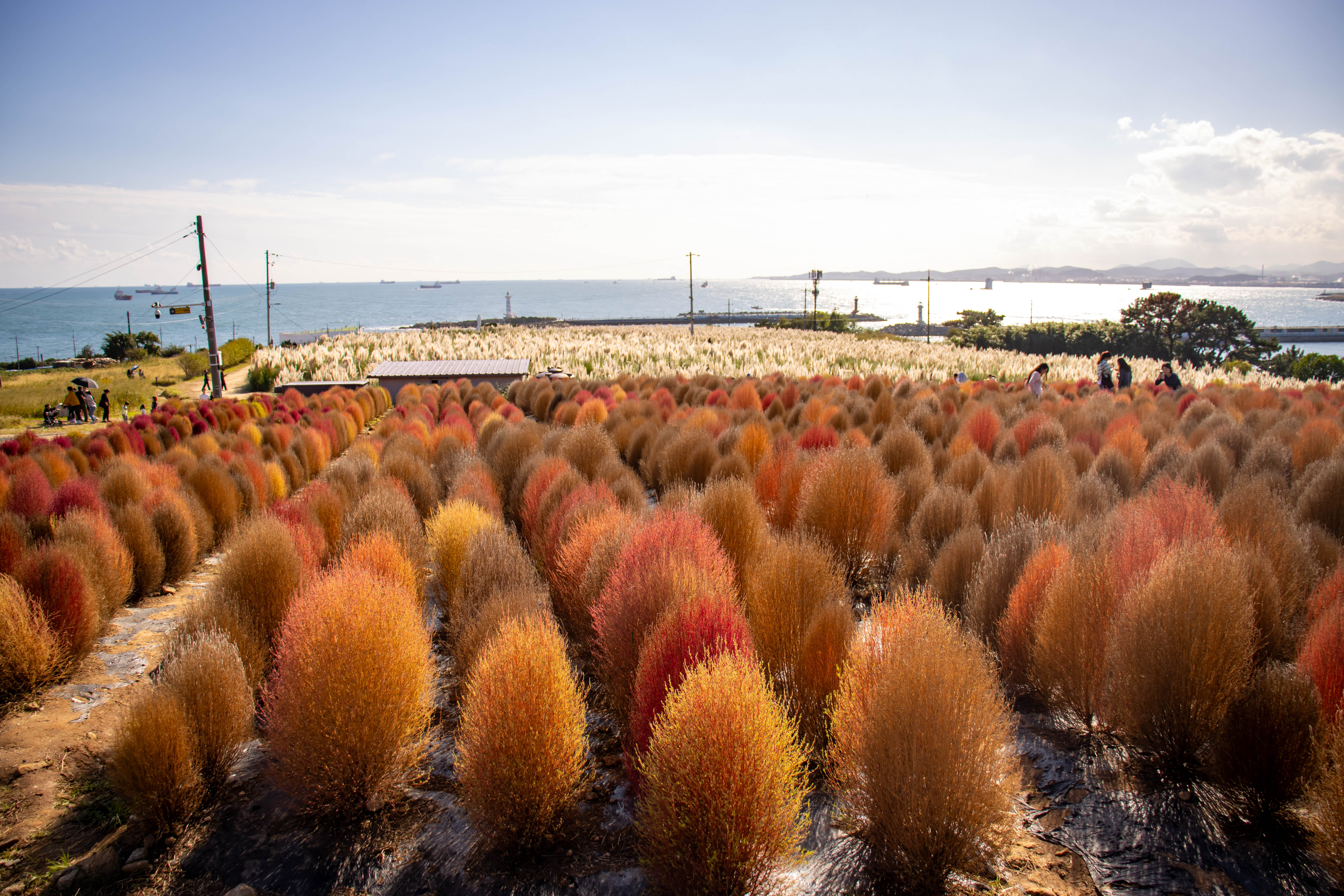 붉은 댑싸리는 일반적으로 9월 하순~10월 중·후반에 색이 가장 선명합니다. 다만 기온·강수 등 기상에 따라 시기가 앞뒤로 변동될 수 있습니다. 해안 특성상 바람이 강하므로 체감온도를 고려해 가벼운 겉옷을 준비하세요.